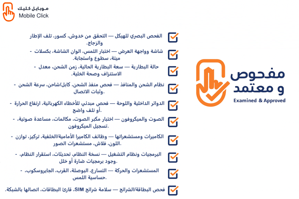 - تُقدم الأجهزة المستعملة بضمان لمدة عشرة أيام يشمل فحص الأداء وحالة البطارية.